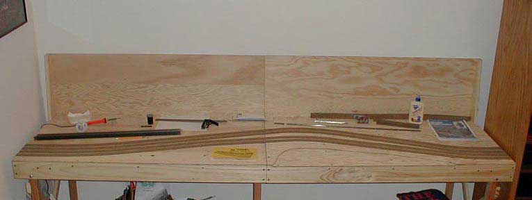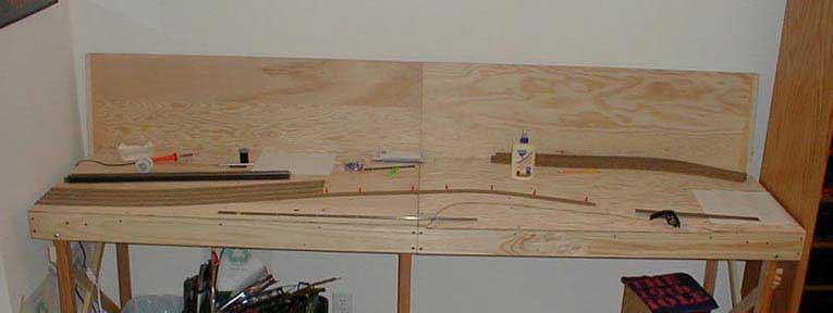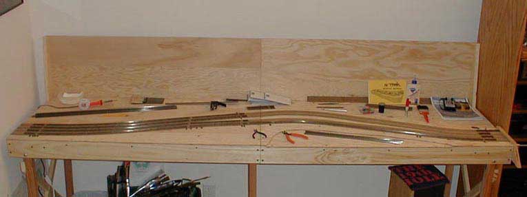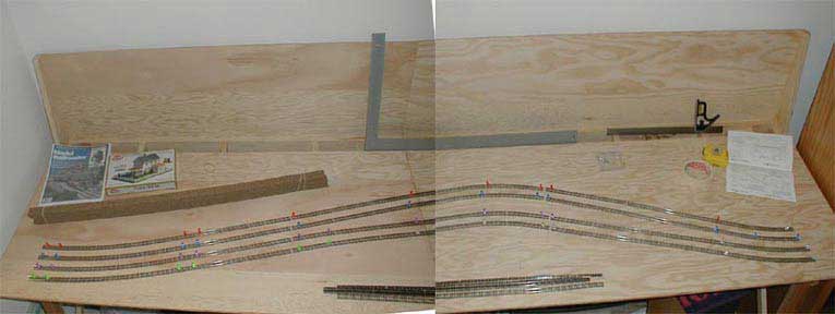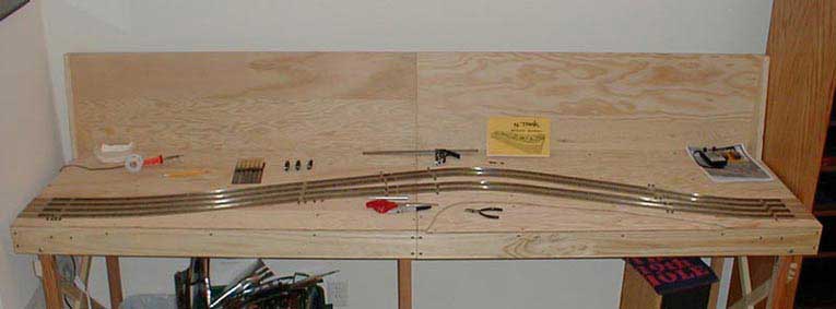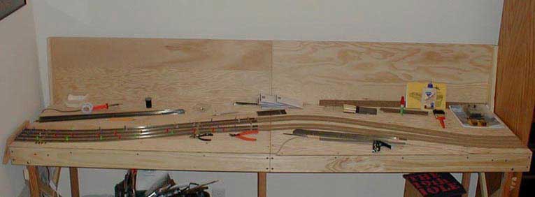 After a module frame building session on 3/11/2002, finishing up on 3/13/2002 at a fellow club member's home, Here's how I began work after taking my new project home.![]() I placed the track on my lines with mapping pins just to get a visual confirmation and approval of their location. Minimum radius allowed is 24" on the mainline by Ntrak standard. Mine are 24.5" or larger. Next step, jigsaw the river out of the front of the plywood. ![]() Here you can see where I used my belt sander to take 1/4" out of the framework where the plywood for the river will go. ![]() The plywood decks have been glued and screwed and I have begun putting the cork roadbed in place after verifying my Ntrak standard measurements for track centerline placement. From the front: 2.5" Orange; 4" Red; 5.5" Yellow; 7" Blue. ![]() All the cork roadbed is laid for the orange, red, yellow and blue tracks! Yeah! I used wood glue to hold the roadbed in place. ![]() 1/2 of the track has been laid! I clamped a board to the left side as recommended and put Atlas 2.5" pieces up against it (held by the blue mapping pins) and began to lay the track. I will be using Krazy glue, about 1 drop every 6-8 ties on each side of the track to hold it in place and soldering the sections of track together when I solder the feeder wires. ![]() I finished putting Krazy glue on the track on the left side and removed the mapping pins. I then began work on the right side... of all things, I ran out of Krazy glue! ![]() All the track is laid and glued! Next comes the feeder wires and soldering!